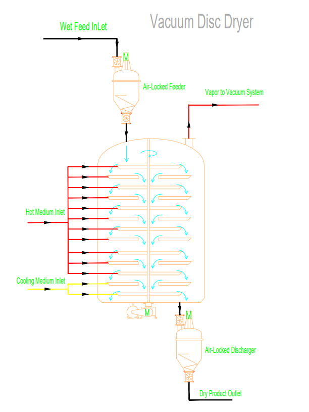 Atmospheric disc dryer | Simple structure, easy operation, high drying efficiency, suitable for materials with normal temperature and no special pressure requirements | 304/316L stainless steel (low corrosion), 2205 duplex steel (medium to high corrosion), titanium (strong corrosion), etc |