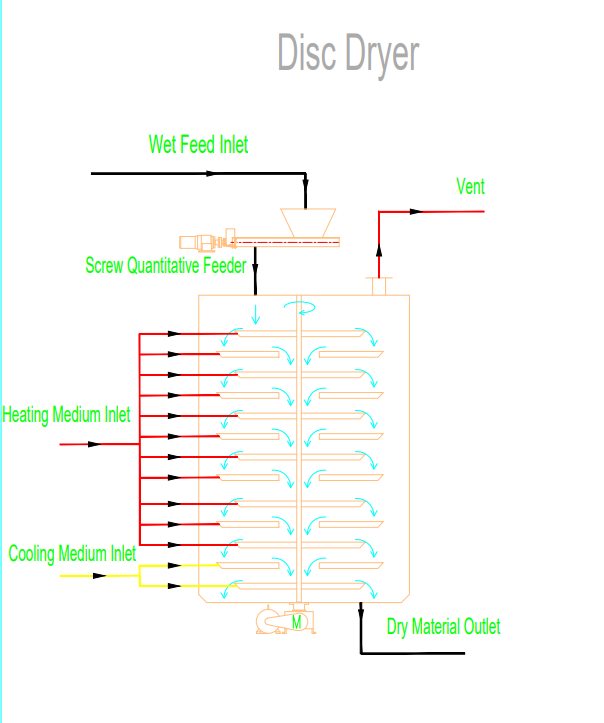 The disc dryer is a highly efficient continuous conduction type drying equipment. The core principle is to conduct heat through the hollow heating disc, causing the material to spread and roll evenly on the disc surface to achieve water evaporation. It has the advantages of high drying efficiency, low energy consumption, and strong adaptability to materials. It can handle various forms of materials such as powder, granules, and paste, and is widely used in the drying and dehydration of materials in many industries. It is particularly suitable for large-scale production scenarios with high requirements for drying temperature and product purity.