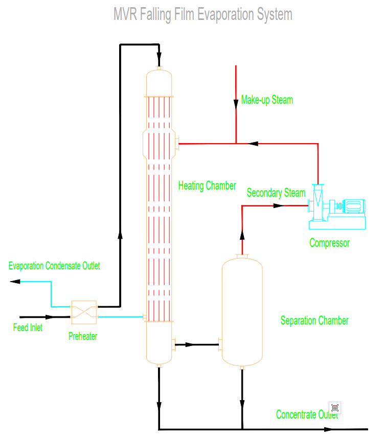 The MVR evaporator is a highly efficient and energy-saving evaporation and concentration device that compresses and recycles secondary steam through a mechanical compressor. It requires only a small amount of steam to start and consumes electricity during normal operation. It can be customized to adapt to complex working conditions in multiple fields and has the advantages of energy saving, stability, and environmental protection.
