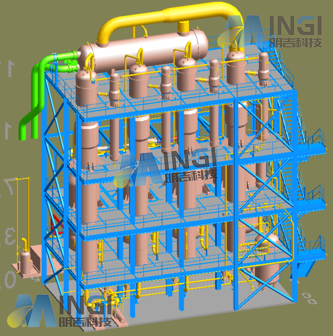Equipment configuration: _ TVR Four-effect Falling film Evaporation system provided by our company _ Main components: 4 falling film evaporators, 4 falling film separators, 5 preheaters, 1 condenser, 4 falling film circulation pumps, 1 vacuum pump, 1 automatic control system and ancillary equipment, the materials of the equipment are 316Ti, 304 stainless steel, 316L stainless steel, etc. according to different parts ________ (brief description of main equipment, auxiliary equipment and materials)